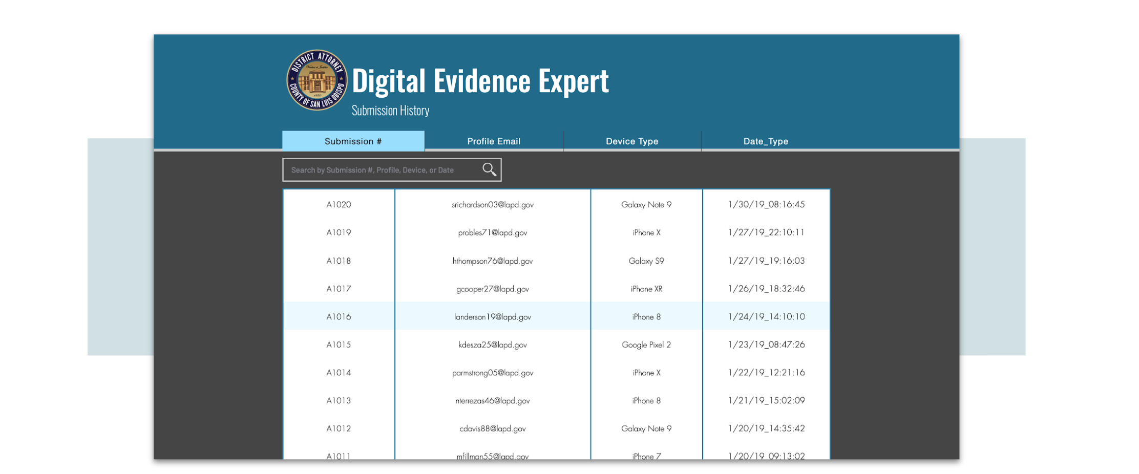 Additionally, I personally created a basic website, showing how officers and agencies as a whole could easily track collections, as well as gather metadata on crimes and digital evidence collected.