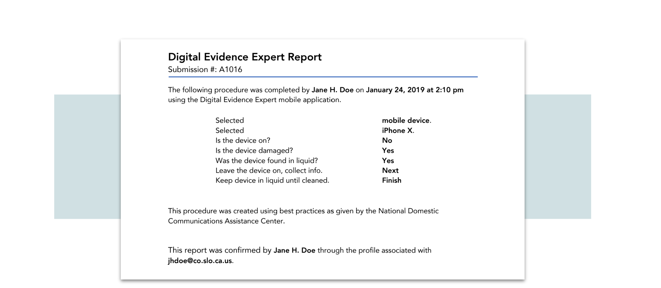 As part of the proof of concept, I created example reports that could be generated by the app for officers, giving not only them, but courts of law the confidence that devices were collected correctly and lawfully.
